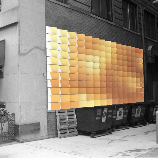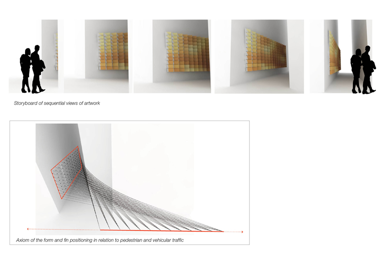 This site-specific public art concept was submitted to the Golden Triangle Business Improvement District in Washington, DC for a location along one of DC’s busiest streets. RKW partnered with the Architectural design team REFORM, to develop a concept that challenged the public art boundaries currently established in this region. We intentionally avoided the obvious applications of flat, two-dimensional artwork typical to street level building facades. Instead we developed a more dynamic, three-dimensional option that activates the space and allows the viewer to interact with from a variety of positions.
